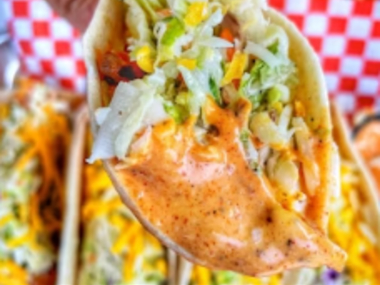 Two Tacos on Flour Tortilla with cheese , fried chicken chopped up, coleslaw and our kluckin sauce on top. Crinkle Fries included