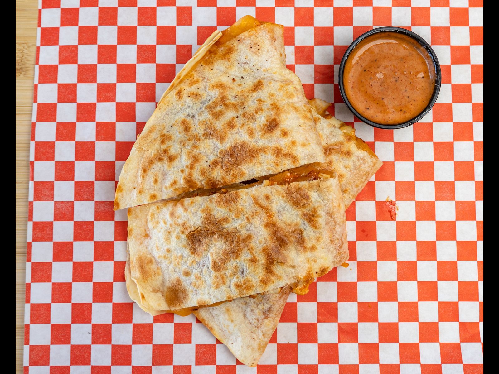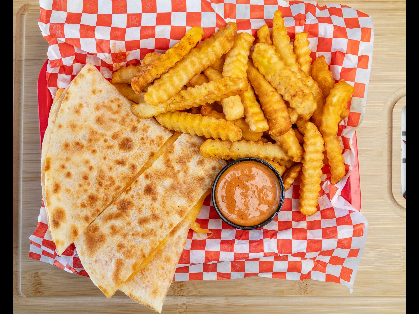 Savor a cheesy delight with our 4-cheese Mexican mix quesadilla. Comes with Crinkle cut fries