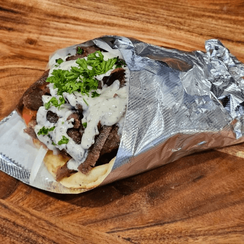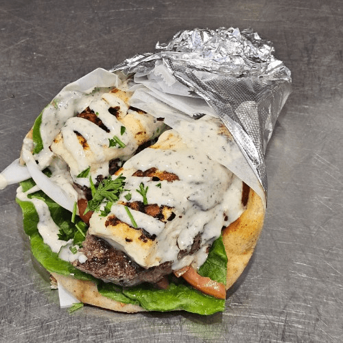 Ground beef mix with garlic, onion and house blend seasoning. Includes a small Greek salad, pita bread and choose fries or rice