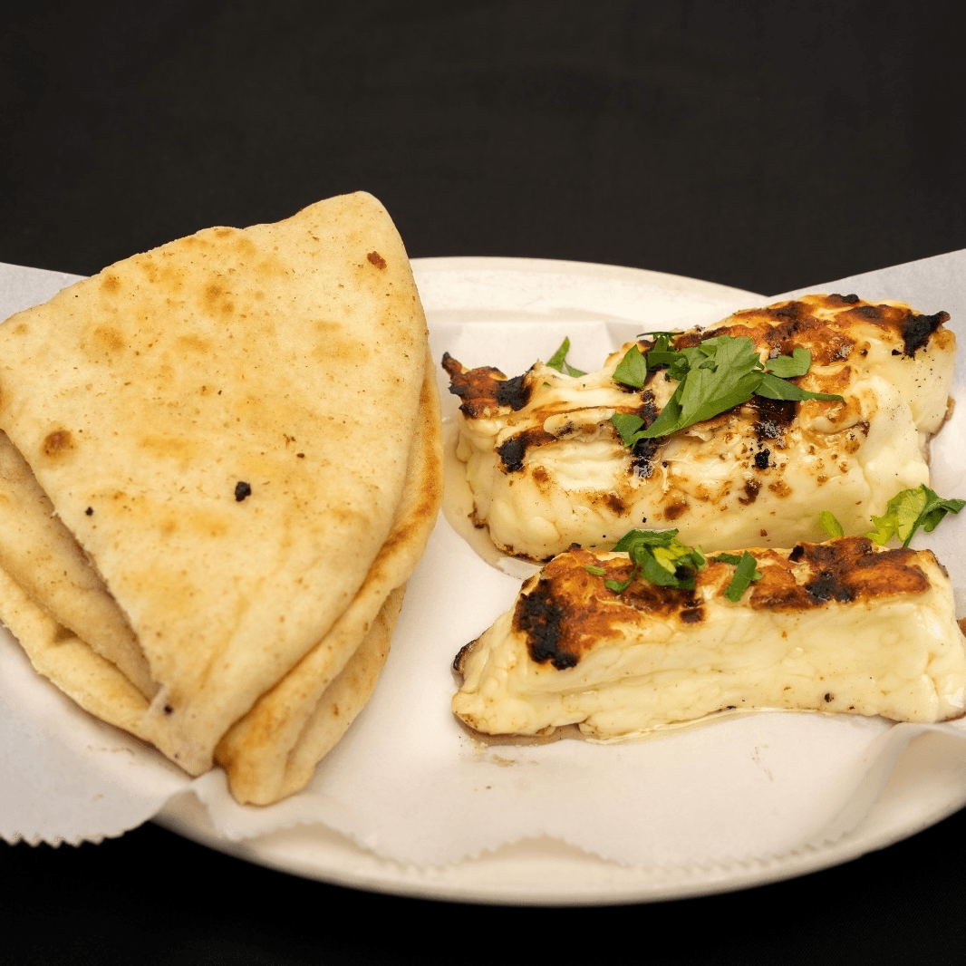 Pita burger with halloumi. Includes fries or rice and choice of drink