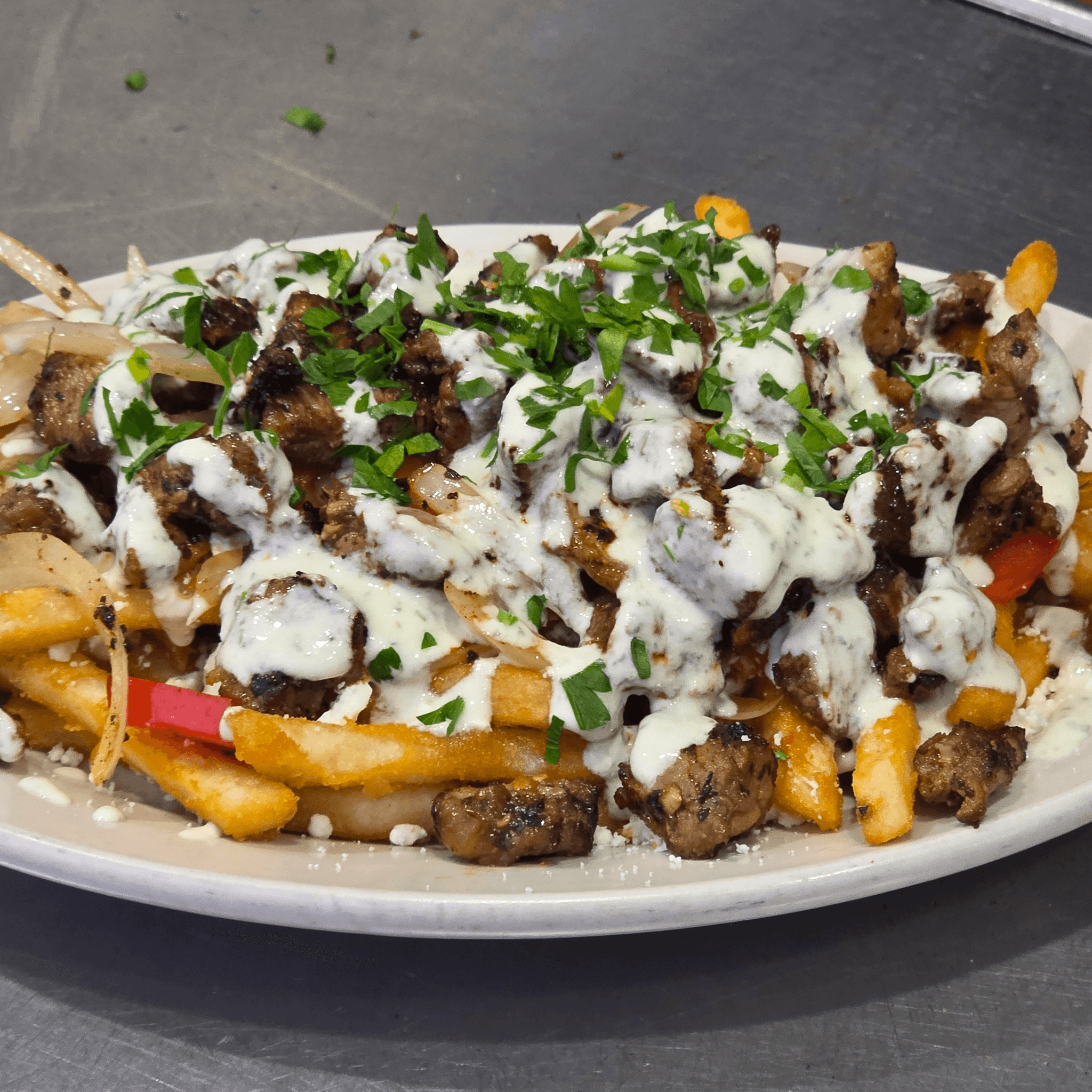 Fries, grilled onions, grilled tomatoes, feta cheese, meat, parsley